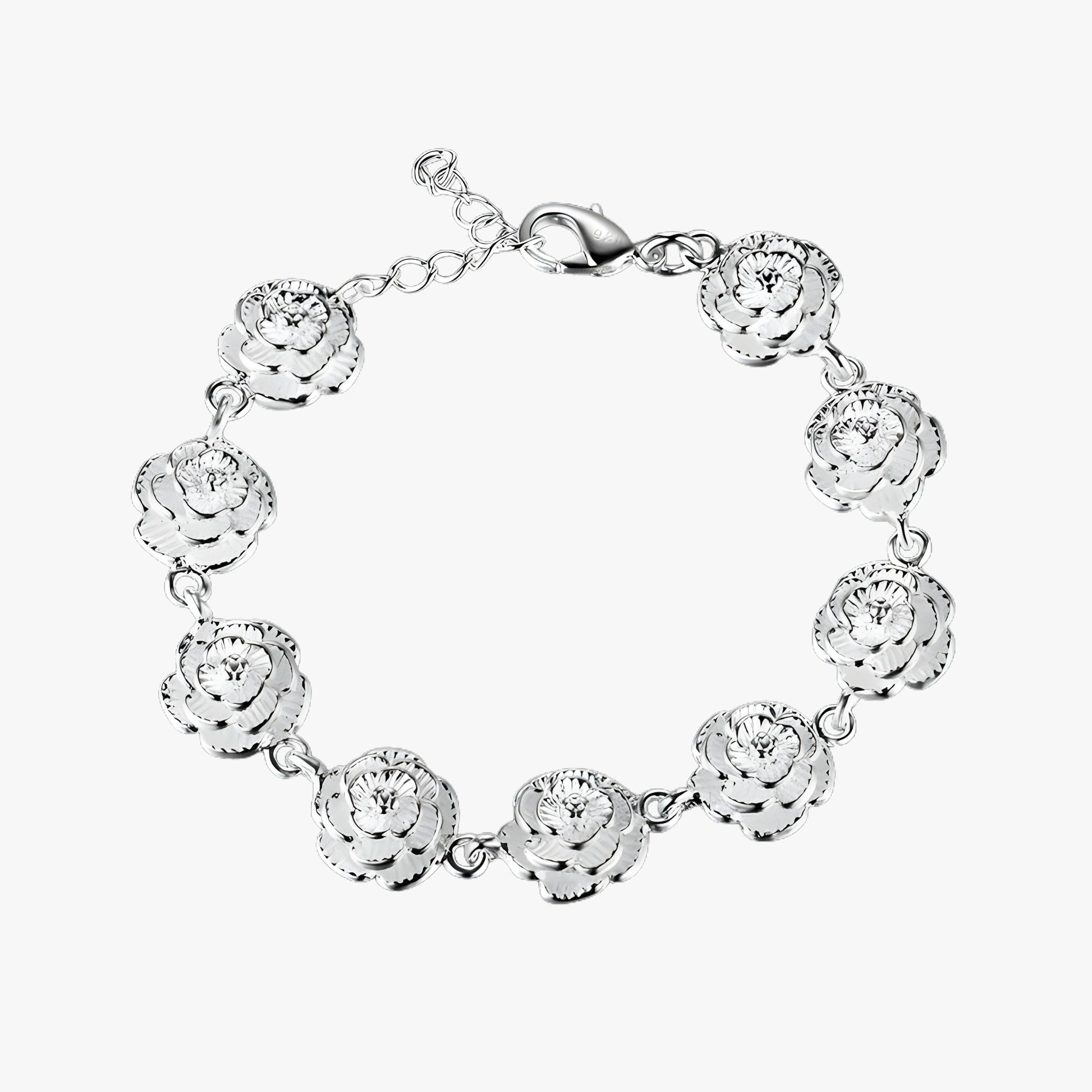 A delicate 925 sterling silver bracelet featuring raised rose detailing. Designed with a 7-inch chain and a 2-inch extender for an adjustable, comfortable fit.